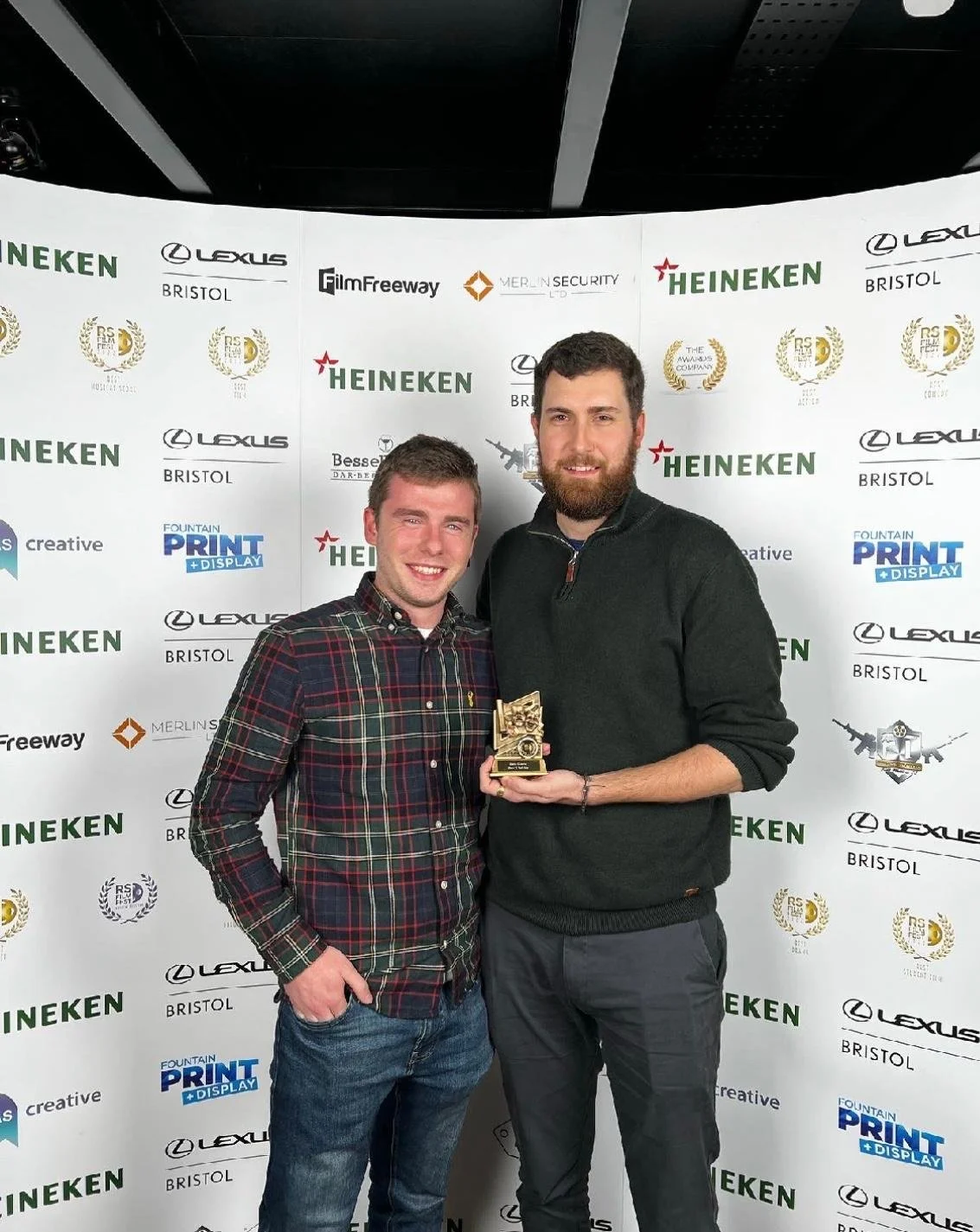 On the left - Company Director Rhys Freeman (L) & Film Director Sam Evans (R) celebrate the win of Best Film at the RS Film Festival in 2022, in Bristol.